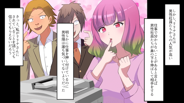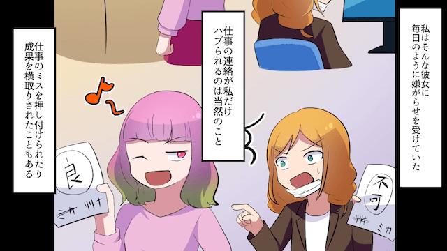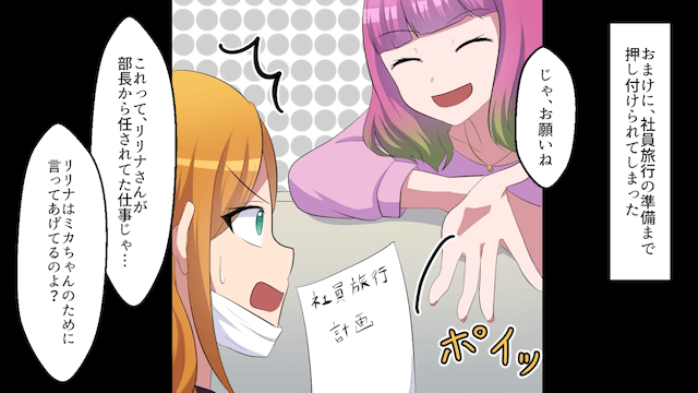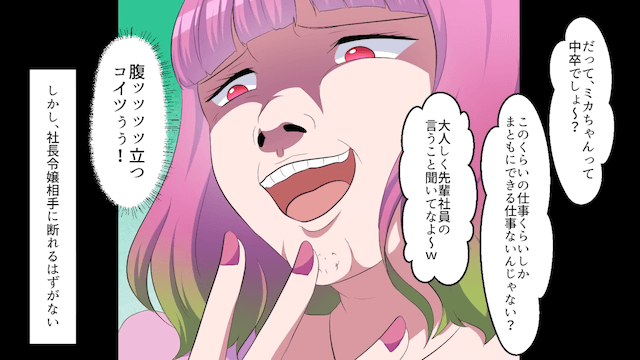 主人公は会社の先輩である社長令嬢からの嫌がらせに悩んでいました。 この日も、中卒だとバカにしてくる社長令嬢に、社員旅行の準備を押しつけられて…。
