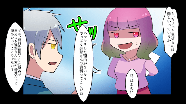 主人公の正体を知った社長令嬢は、自分のほうが優秀だと怒り狂いますが…。