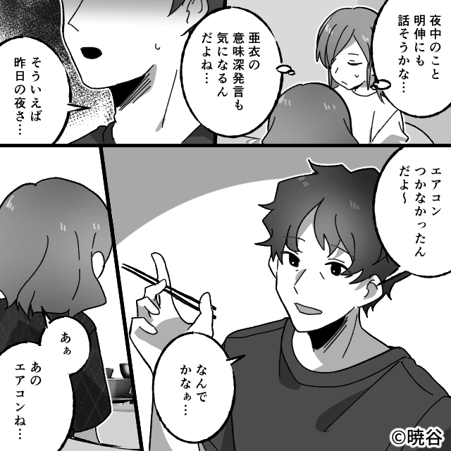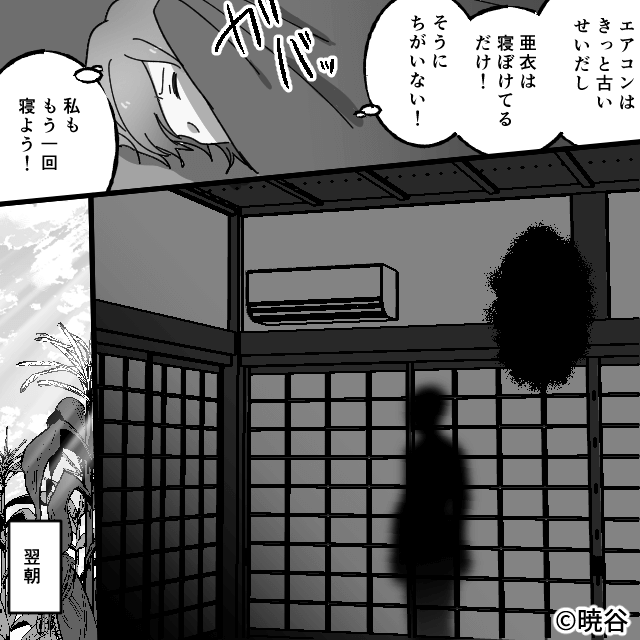 深夜目を覚ますとエアコンが動いていて、主人公は不思議に思います。 すると同じく目を覚ました娘が、突然「エアコンとお話してるのかな…?」と意味深な発言をして、すぐに眠ってしまいました。