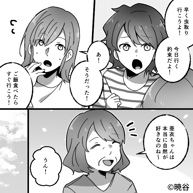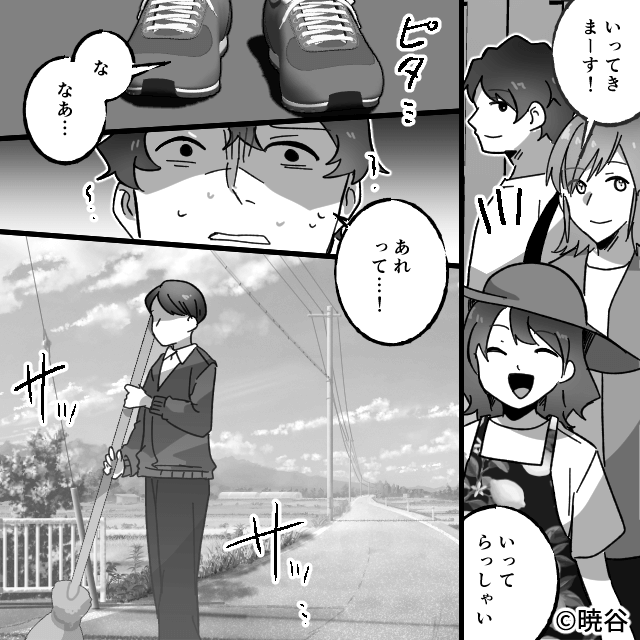 誰がエアコンを切ったのかわからず、ゾッとして静まり返る主人公たち。 そんなとき娘が「早く虫取り行こうよ!」と言い始めたため、主人公たちは外に出ます。