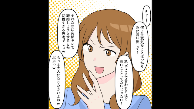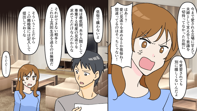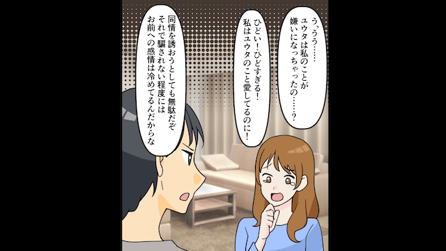 予想外の返答に焦った妻は涙を流したり開き直ったりしますが、主人公は同情することもなく…。