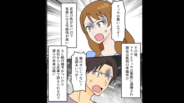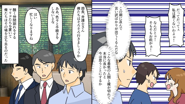 妻と幼なじみに渡したお金が総額50万円になっていたため「詐欺として被害届を出すのには十分すぎる金額だと思うが?」と伝えた主人公。 すると焦った妻は幼なじみを裏切り、主人公に復縁を求めてきたのです。