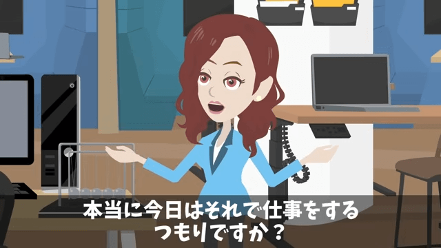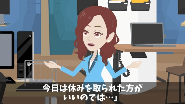 トイレから戻った男性社員は、主人公たちに何の話をしていたのか尋ねました。 そして、男性社員の様子を見た女性社員は「今日は休みを取られたほうがいいのでは…」と提案します。