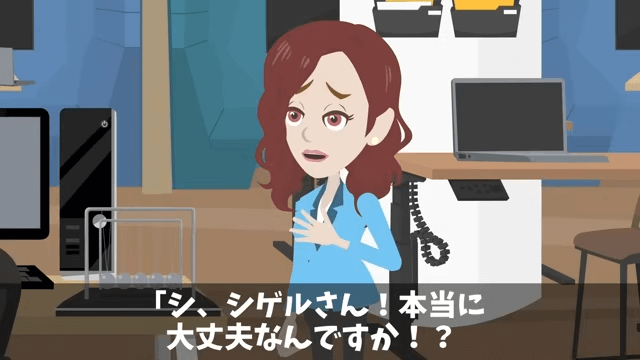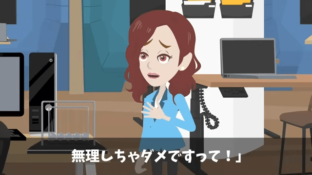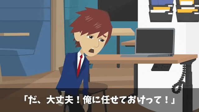 女性社員が男性社員の仕事をどうしようか悩んでいると、男性社員が「だ、大丈夫!俺に任せておけって!」と言いました。 しかしそんな男性社員に、女性社員は「無理しちゃダメですって!」と伝えます。