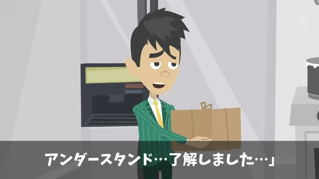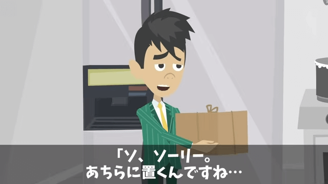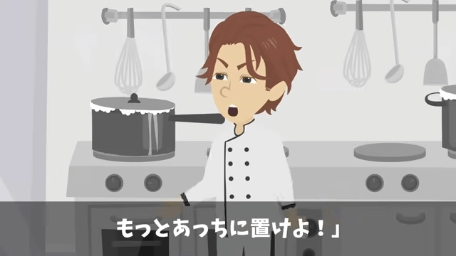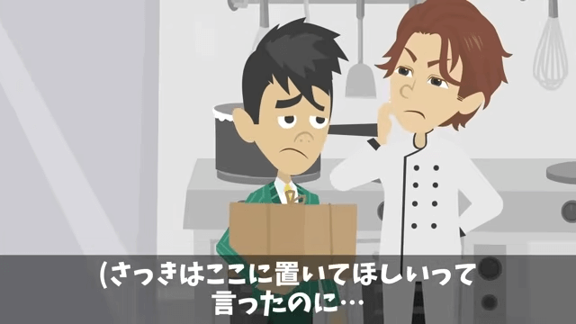 主人公が食材を置くと、板前が冷蔵庫の扉が開けられないと怒ります。 そして板前から「もっとあっちに置けよ!」と言われた主人公は、板前に謝り、食材を移動させました。