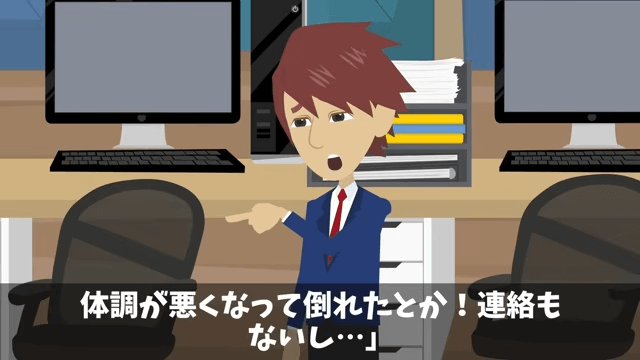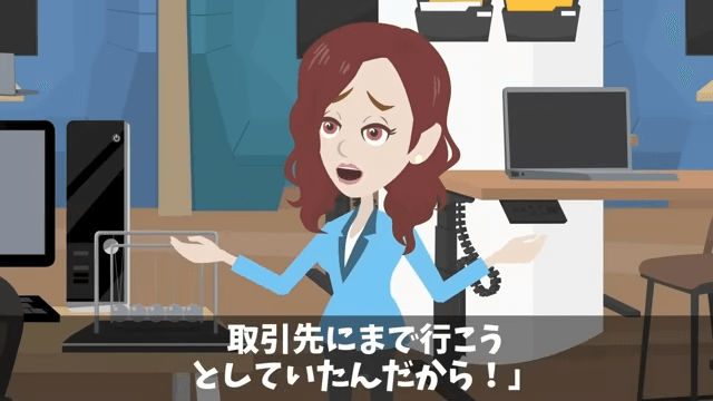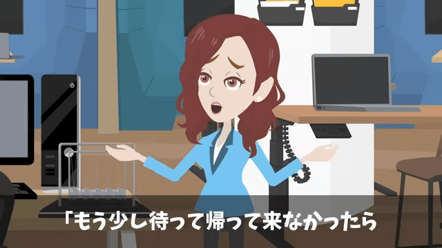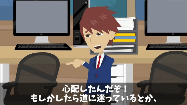 男性社員は主人公が何かに巻き込まれたのではないかと心配したと言います。 そして女性社員は「もう少し待って帰ってこなかったら取引先にまで行こうとしていたんだから!」と主人公に言いました。