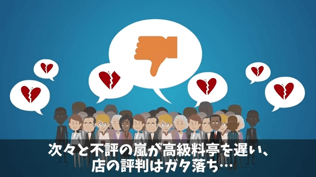 鰻を楽しみにしてきた客は、鰻がないと知って怒り出します。 さらに客がそのことをSNSに投稿したため、店の評判は一気に落ちてしまいました。