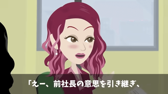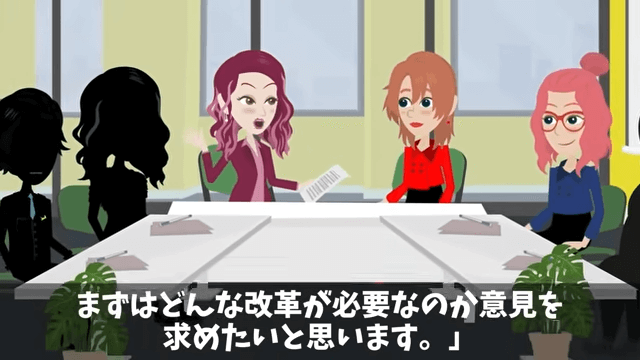 主人公は前の社長の意思を背負った気持ちで会議に参加します。 会議が始まると、新社長が「まずはどんな改革が必要なのか意見を求めたいと思います」と言いました。