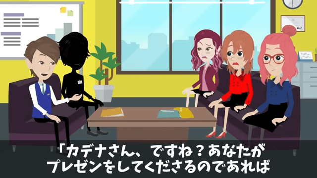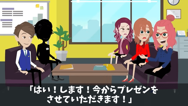 取引先の担当者は「あなたがプレゼンをしてくださるのであれば私は聞かせていただきたい」と主人公に伝えます。 それを聞いた主人公は「はい!します!今からプレゼンをさせていただきます!」と張り切り…。