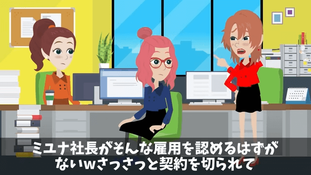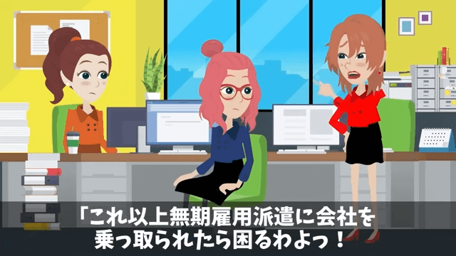 社員は主人公に「これ以上無期雇用派遣に会社を乗っ取られたら困る」と言いました。 そして社員は「主人公は新社長に契約を切られて終わりだ」と馬鹿にして…。