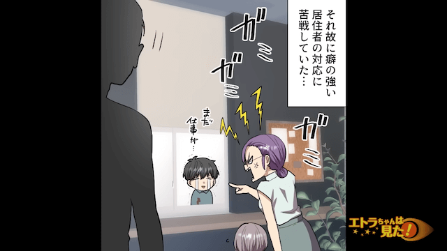 マンションの管理人をしている主人公は、クセの強い女性の対応に苦戦していました。 ある日も女性に「植え込みの樹伸びすぎじゃないの!?」とクレームをいれられ、主人公は困惑。
