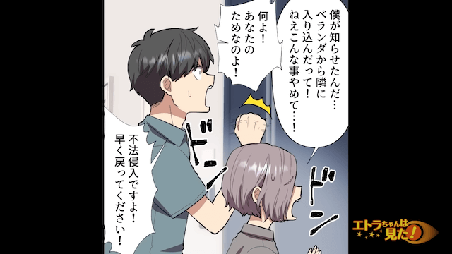 女性の子どもに「管理人さん!大変だよ!」と声をかけられ、驚く主人公。 なんと女性が男性の部屋を調べるため、ベランダをつたって不法侵入したようなのです。