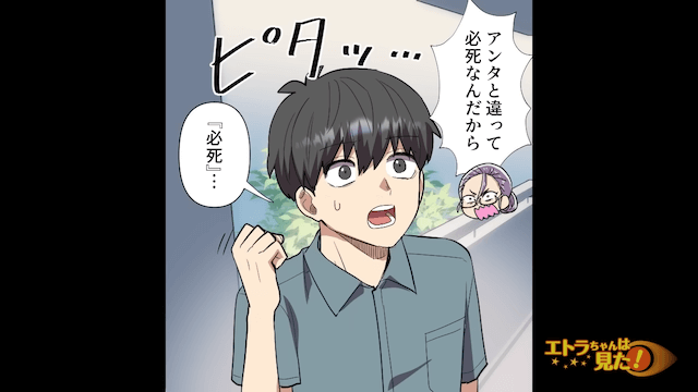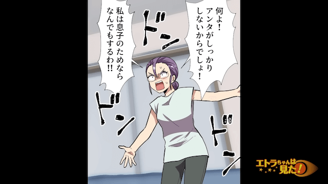 主人公と女性の子どもは部屋の外から女性を説得しますが、女性は「アンタと違って必死なんだから」と子どものためを思って行動しており…。