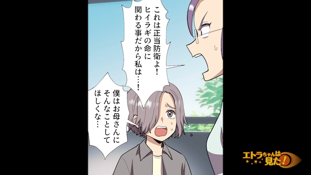 「私は刑務所に入ってでも息子を守ってみせるわ!」と興奮状態で話す女性のもとに警察が到着し、女性は確保されました。 男性も戻ってきましたが、女性は不法侵入をしたのは男性のせいだと言って「これは正当防衛よ!」と叫び…。
