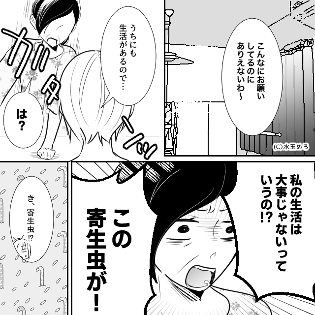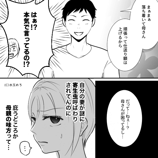 すると義母は「この寄生虫が!」と主人公を罵り、夫は義母の味方になり…。