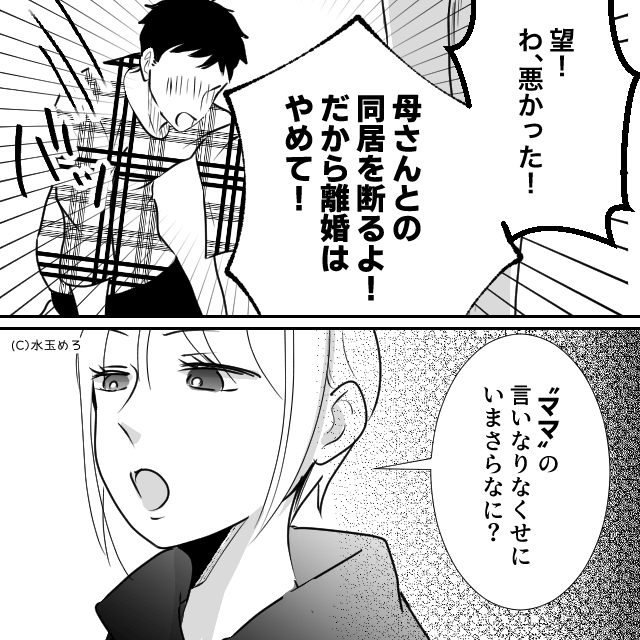 「母さんの言うこと聞かないと離婚だよ?」と主人公を丸め込もうとする夫に、我慢の限界を感じた主人公。 そして主人公は「母親を選ぶか私を選ぶか今すぐ決めてくんない?」と夫に迫り、はっきり答えない夫にうんざりして離婚を突きつけます。