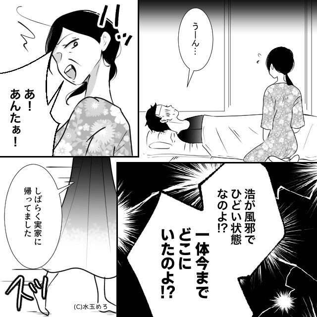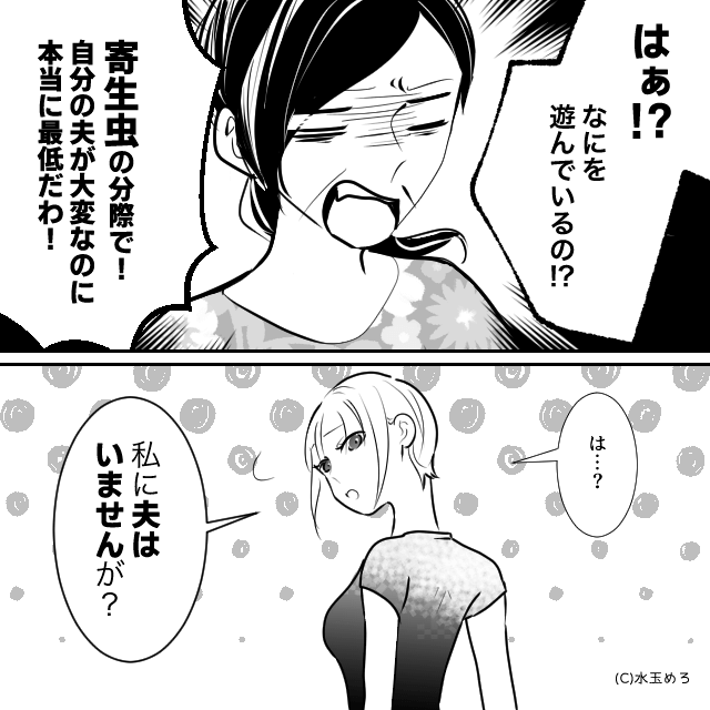 義母は家にいなかった主人公を責めて「自分の夫が大変なのに本当に最低だわ!」と怒りますが、主人公は「私に夫はいませんが?」と答え…。