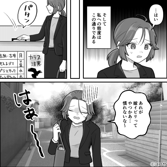 同居している義母に、嫁いびりをされている主人公。 義母は外面がよく、2人きりのときにしか嫁いびりをしてこないため、主人公は悩んでいて…。