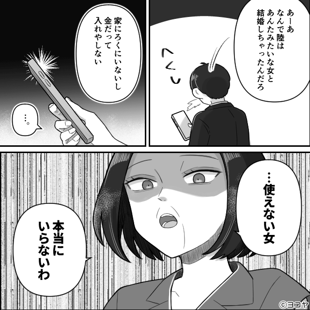 今回は『夫が海外出張中、義母の“本性”がむき出しになった話』を紹介します。 義母の嫁いびりに限界を感じ、ベビーカメラを使って反撃を決意した主人公。 それから1週間後、義母に「今月の生活費の30万は?」と言われ…。 義母に追加で20万円の生活費を求められ、困惑する主人公。 義母は「こっちは家に住まわせてんのよ?」と、自分の私利私欲のためのお金を主人公にたかります。 そのため主人公が「同居はお義母さんが頼んできたんじゃないですか!」と言い返すと、義母は怒って「使えない女。本当にいらないわ」とひどい発言をしたのでした。