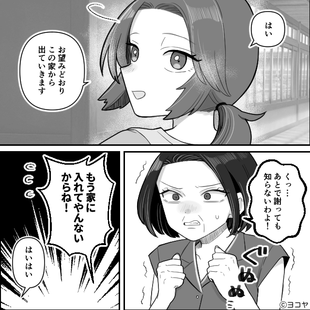 義母に「さっさと私の家から出ていきなさい!」と言われ「今日中には出ていきますね〜」と答えた主人公。 すると義母は焦り「あとで謝っても知らないわよ!」と悔しそうにします。