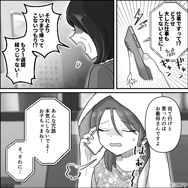 義実家を出て1週間、義母からしつこく電話がかかってくるため、電話に出た主人公。 義母は「いつまで帰ってこないつもり!?」と怒っていて、夫が帰ってくるため焦っているようでした。