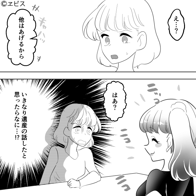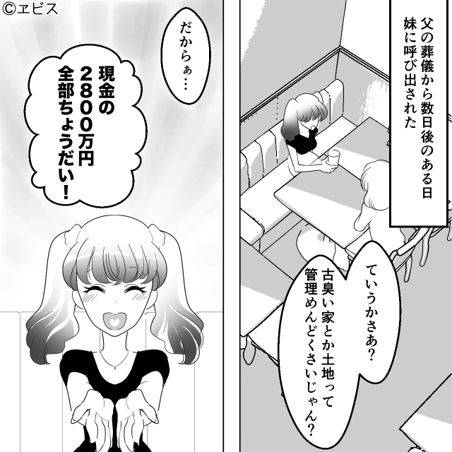 父の葬式にも来なかった夫が遺産の話ばかりするため、うんざりしていた主人公。 さらに妹も「現金の2800万円全部ちょうだい!」と信じられない要求をしてきて…。