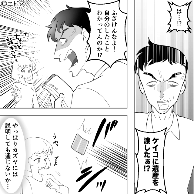 主人公が夫に事情を説明すると、夫は「ふざけるな!」と激怒しました。