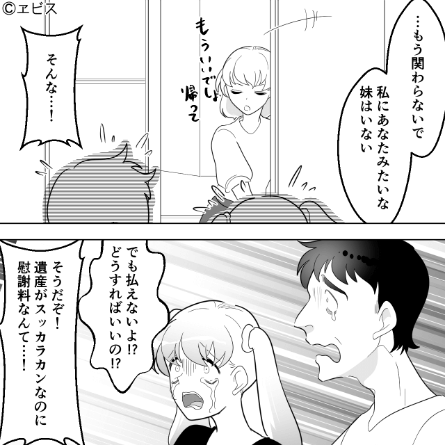 遺産で慰謝料の支払いをされるのが許せなかったため、半年間、慰謝料請求をしていなかった主人公。 真実を知った妹と元夫は「どうすればいいの!?」と絶望します。