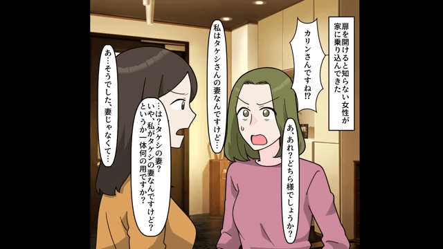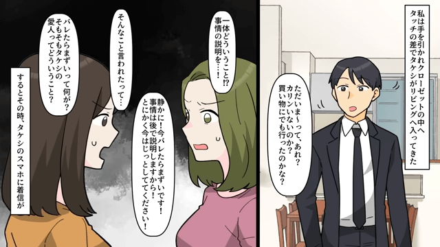 主人公が料理を作りながら夫の帰りを待っていると、何度もインターホンが鳴りました。 そこで主人公が扉を開けると、夫の浮気相手だという女性が乗り込んできて、そのまま主人公と一緒にクローゼットの中に隠れたのです。