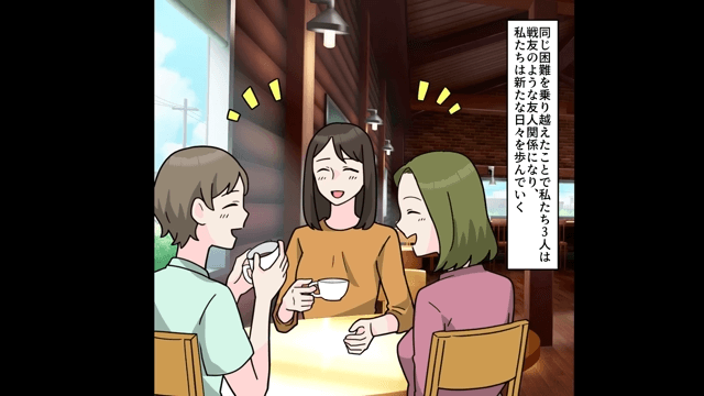 主人公と離婚した夫は、会社を解雇され、孤独な生活を送ることになります。 そして浮気相手たちと友人関係になった主人公は、新たな日々を歩んでいくのでした。