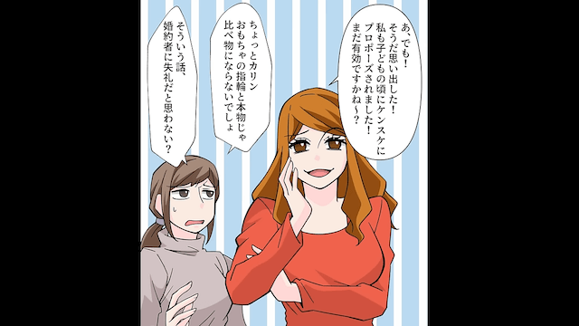 彼氏にプロポーズをされて婚約したため、社長に報告をした主人公。 数日後、スーパーで偶然彼氏の幼なじみに会った主人公が婚約したことを報告すると、彼氏の幼なじみは青ざめます。
