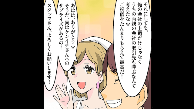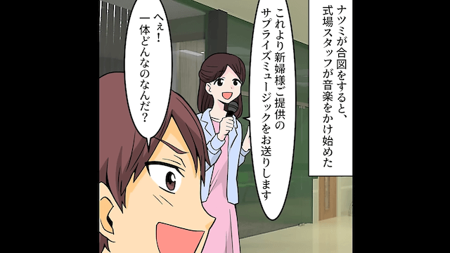 親友との思い出に浸っていた主人公のもとにあるメッセージが届き、主人公はそれを読んで結婚式への出席を決めます。 そして結婚式当日、親友は婚約者に「サプライズがあるの!」と告げ、式場スタッフに合図をしました。