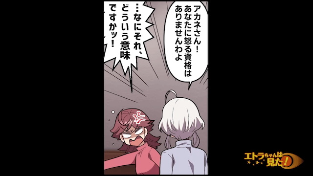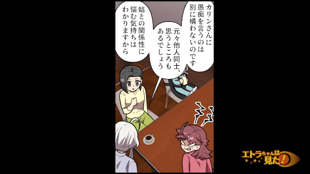 「知ったってなにを…?」と困惑するママ友のもとに、ママ友の義母が登場。 主人公に裏切られて義母に愚痴を聞かれていたことに気づいたママ友は、主人公に激怒します。