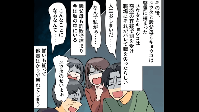 元夫と浮気相手は職を失い、義両親は詐欺罪で捕まりました。 そして、お腹の中に新しい命を宿した主人公は、夫と幸せな日々を送るのでした。