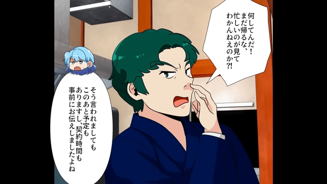 契約時間になったので主人公が帰ろうとすると、店長が「何してんだ!まだ帰るな、忙しいのが見てわかんねえのか!?」と怒ってきました。 そこで主人公は、事前に契約時間についても伝えたはずだと言いますが…。