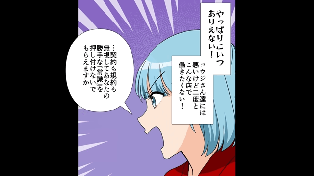 我慢の限界だった主人公は「契約も規約も無視してあなたの勝手な常識を押しつけないでもらえますか!」と店長に言いました。 すると店長が「ああ?店を回すためだろうが」と言い返してきて…。