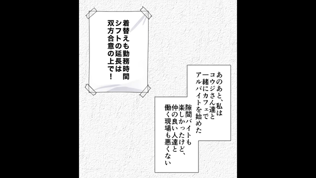 主人公は店のスタッフたちと一緒にカフェでバイトを始めます。 そして主人公は、これからもちゃんと笑って働ける場所を選んでいこうと思うのでした。