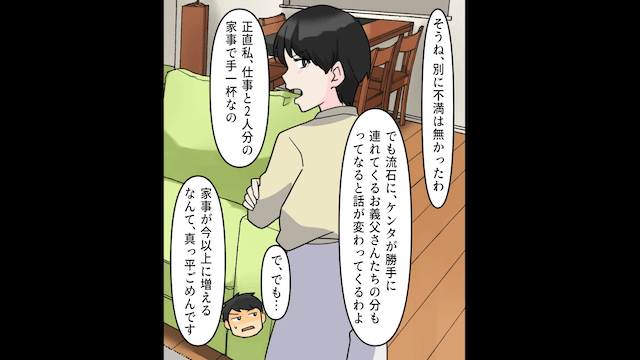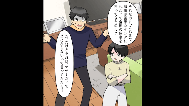 夫は青ざめて文句を言ってきますが、主人公は「正直私、仕事と2人分の家事で手一杯なの」と伝えて…。