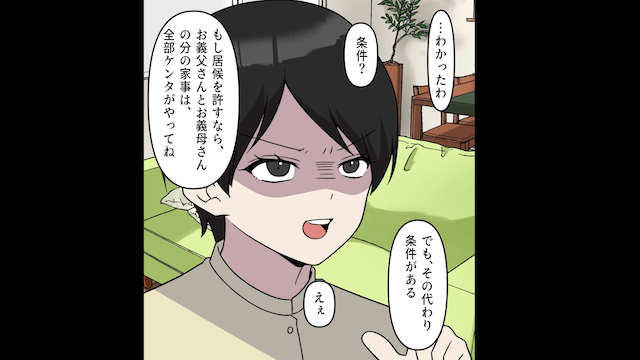 ある日突然、夫は義両親を居候させることを主人公に報告してきます。 居候は義実家のリフォームが終わるまでの数ヶ月間で、主人公は相談もなく決めた夫に激怒し「もし居候を許すなら、お義父さんとお義母さんの分の家事は全部あなたがやってね」と条件を突きつけました。