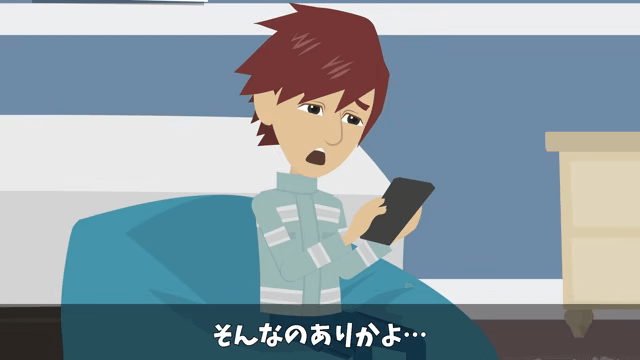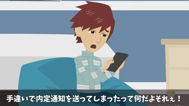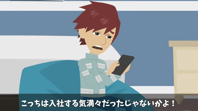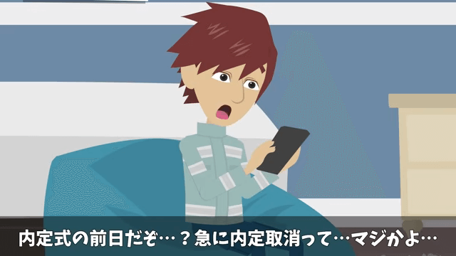 内定式の前日、主人公が持ち物を確認していると会社から連絡がありました。 そして内定取り消しを知った主人公は「そんなのありかよ…」とショックを受けたのです。