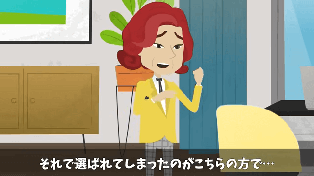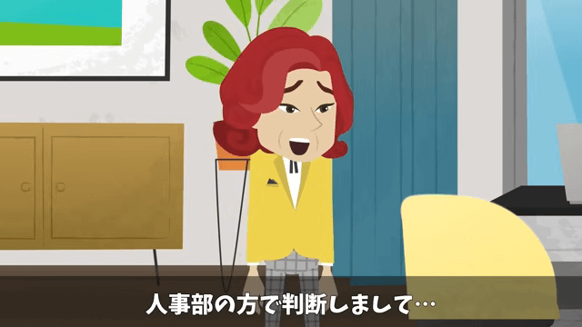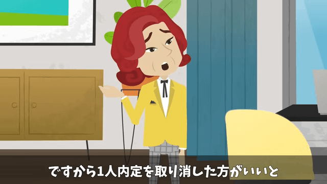 人事部長は新入社員の入社人数が1人オーバーしていたことを社長に説明します。 そして結果的に内定を取り消されることになったのが主人公だと言い、人事部長は主人公に謝りました。