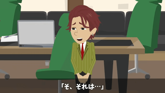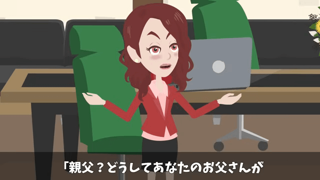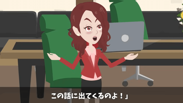 同僚は自分の父から、主人公が社長のお気に入りだと聞いたと説明します。 それを聞いた社長は「どうしてあなたのお父さんがこの話に出てくるのよ!」と言いました。