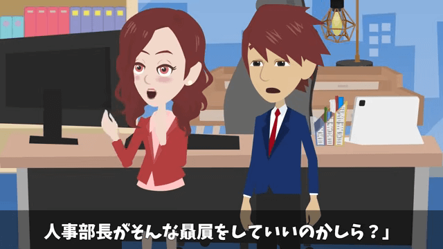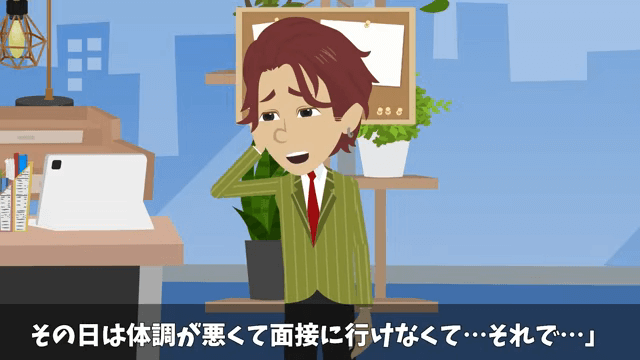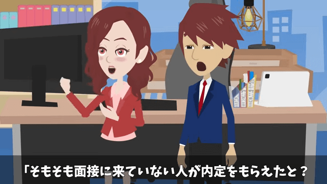 追い詰められた同僚は、体調不良で面接に行けなかったことを話しました。 それを聞いた社長は「そもそも面接に来ていない人が内定をもらえたと?人事部長がそんな贔屓をしていいのかしら?」と人事部長に尋ねます。