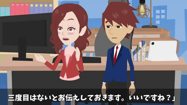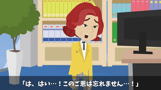 社長が人事部長に「三度目はないとお伝えしておきます。いいですね?」と言うと、人事部長は「は、はい…!このご恩は忘れません…!」と頭を下げました。 一方、同僚は「お、俺は…!」と戸惑っている様子で…。