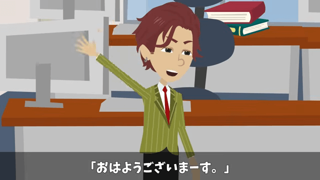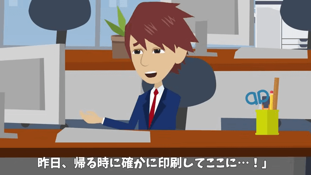 主人公は昨日帰るときに書類を印刷してデスクに置いておいたと社長に説明します。 するとそのとき、同僚が「おはようございまーす」と言いながら出社してきました。