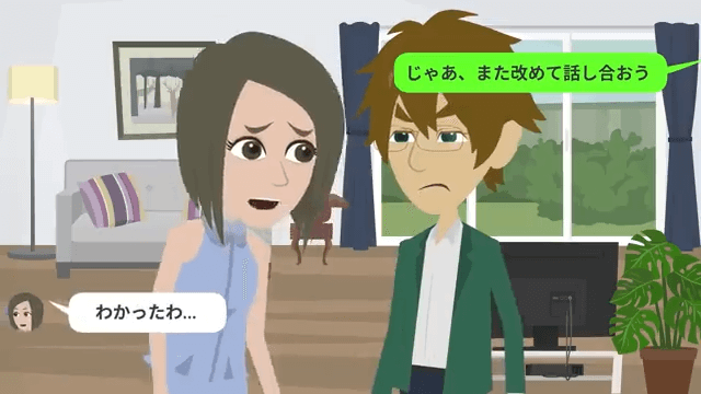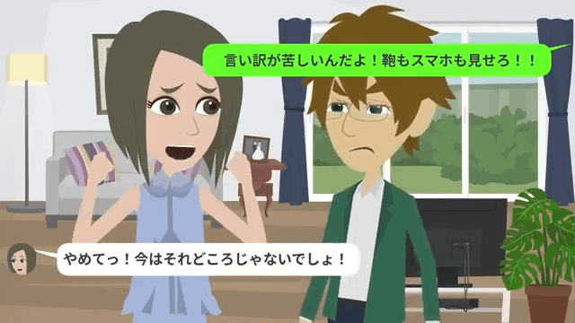 主人公は妻の浮気を疑いますが、妻は「やめてっ!今はそれどころじゃないでしょ!」と言いました。 それを聞いた主人公は「くっ…とりあえず実家に帰るんだ」と妻に伝えます。