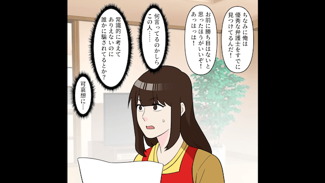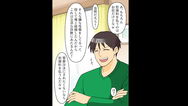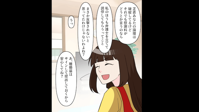 弁護士である女性は「証拠を捏造してでもあなたを勝たせてみせるから」と自信満々に言い、夫は女性の言葉を信じて勝ち誇りました。 そして新婚旅行から帰宅後、夫は主人公に離婚を突きつけて慰謝料を請求したのです。