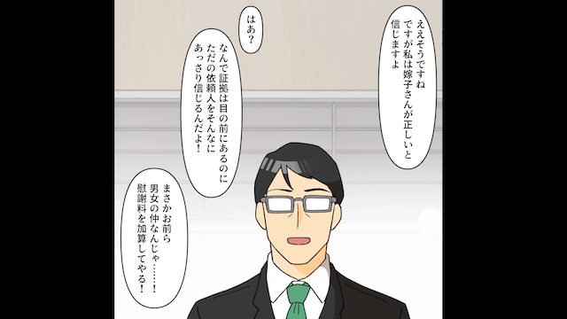 今回は『新婚旅行から帰った途端…夫「じゃあ離婚で!」というので速攻離婚した結果』を紹介します。 離婚調停の話し合いの日、主人公が名誉毀損をしている証拠とともに1000万円の慰謝料を請求してきた夫と女性。 夫の弁護士である女性は「警察沙汰にされたくないなら大人しく慰謝料を支払うことをおすすめします」と言ってきて…。