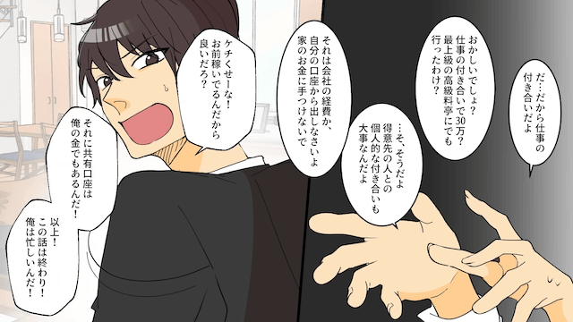 主人公が自分の給料明細を見せて夫より稼いでいることを明かすと、夫は面目を失い家を飛び出しました。 そして以前よりも多額のお金を引き出すようになった夫は、主人公との話し合いにも応じようとせず…。