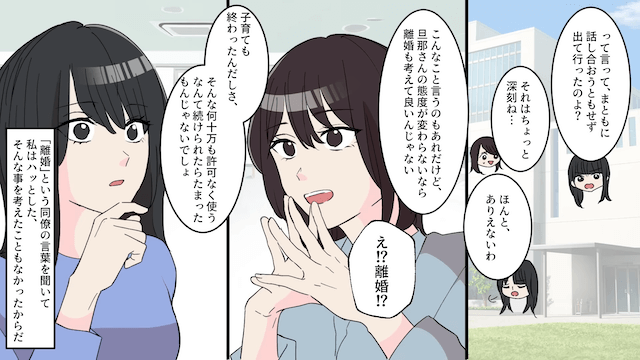 うんざりした主人公が同僚に愚痴をこぼすと、離婚を勧められるのでした。